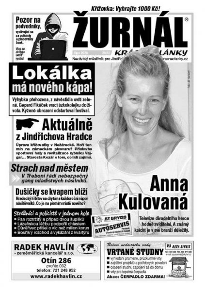 Inzertní noviny Žurnál vychází jako měsíčník v regionu Jindřichův Hradec. V černobílé podobě nabízíme regionální inzerce a informace z regionu. Otevřené a necenzurované zprávy z města Jindřichův Hradec, Dačice, Třeboň, Kamenice nad Lipou, Žirovnice a Počátky. Naše články jsou psané vtipnou a necenzurovanou formou, nejnovější zprávy z regionu a přímo z Vašeho města. Dále si můžete přečíst zajímavé glosy, poznámky a komentáře.